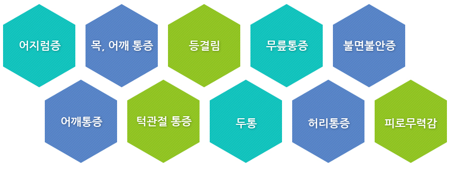 목, 어깨, 허리 등의 근육과 관절이 뻣뻣하고 아프거나 저리게 되는데, 이런 부분은 한의원에서 잘 치료되고 관리가 됩니다.