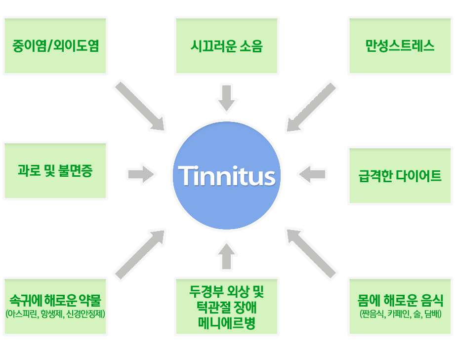 달팽이관의 신경세포, 특히 외유모세포의 기능이 큰 소음이나 항생제와 같은약물, 중금속 및 환경유해물질, 독소나 노폐물, 염증, 노화현상 등으로 떨어지면 뇌줄기에 있는 등 쪽 달팽이 팩(dorsal cochlear nucleus)을 적절히 억제해주지 못하므로 내유모세포가 과잉흥분하여 아주 작은 소리도 과민하게 소리로 전달하게 됩니다.