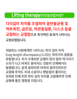 하지불균형으로 인한 체성 감각성 이명증에 사용하는 치료법입니다. 불균형된 자세를 바로잡는 것은 전신의 체성감각의 안정을 유도함으로써 밖에서 들어오는 정보왜곡을 막고 자율신경의 안정을 통해 이명증을 치료할 수 있습니다.
