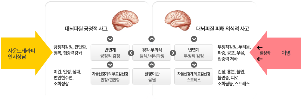 부정적으로 연합된 소리는 자율신경계의 교감신경부분을 활성화시킨다. 반대로 자신이 즐기는 음악처럼 긍적적인 소리자극은 부교감 신경을 활성화시킨다. 이명은 부정적 소음으로 교감신경을 자극하여 변연계를 활성화시키고 부정적 감정반응을 일으킨다.